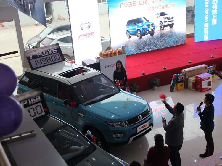 12月25日,广汽吉奥汉中锦程4S店于圣诞之日举行了广汽吉奥“威武双雄”——GX6、GP150新车上市品鉴会。现场人头攒动,千呼万唤始出来——期待已久的广汽吉奥全新SUV车型GX6和新生代大皮卡GP150终于揭开帷幕,欢呼声、喝彩声接连不断;赞美声、惊叹声萦绕耳际。