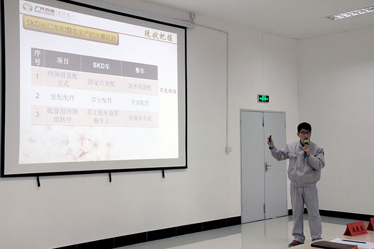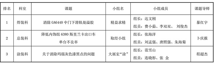 本次课题发布生产实践课题涵盖冲压、焊装、涂装、总装是四大领域,总计8个课题,多为基础课题。为验收生产实践阶段的成果,储训生在课题发布会上以QC发表的方式向生产领域科长进行汇报。会议现场每小组在10分钟内,用较为清晰的思路对课题进行了讲解,从课题的确立到现地现物地分析,用简单的图表展示问题并将解决问题的思路呈现出来,这种持续改善的意识以及较为科学的改善方法获得了评委们的一致好评。在经过近2个小时的激烈角逐中,也诞生了本次课题发布的前三名,他们是: