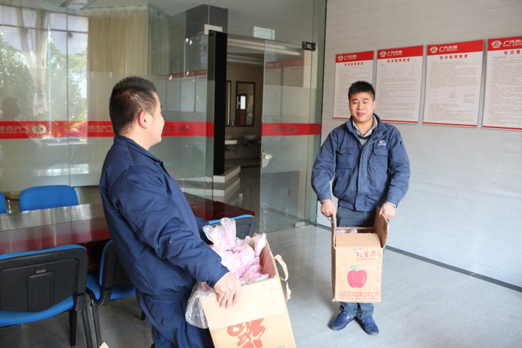 前几日,公司工会特地从水果市场精心挑选了美味可口的野生精品苹果,作为平安夜福利发放给每一名在职员工。上午10点整,工会工作人员将事先包装好的525个苹果整齐摆放在桌子上,并通知各部门派代表过来领取。10点10分左右,工友们陆陆续续赶过来,发放现场气氛非常热烈,大家脸上都挂着笑容,喜悦之情溢于言表,工作人员们配合非常默契,有的在维护秩序,有的负责核对清单,有的在清点平安果,各司其责。他们将承载着广汽吉奥路桥分公司对员工关怀的平安果装进袋子里,装入箱中,分发到员工的手中。工友们在领取后欣喜地对我们说:“真好,平安夜公司还想到给我们发苹果”,“真漂亮,还给我们苹果套上了包装袋”,“一进来就闻到满屋的苹果香味”……